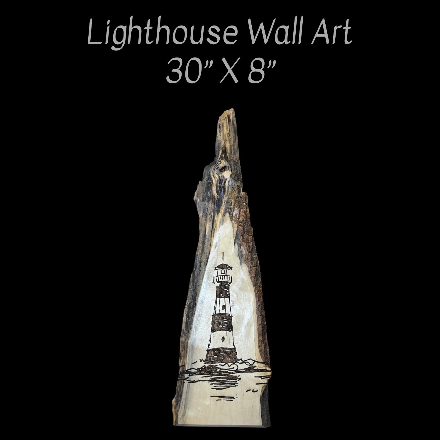 The live edge and unique shape of this board, with the stunning engraved light house make it a perfect gift for those on your lists that love a coastal vibe! 30"W x 8"H.